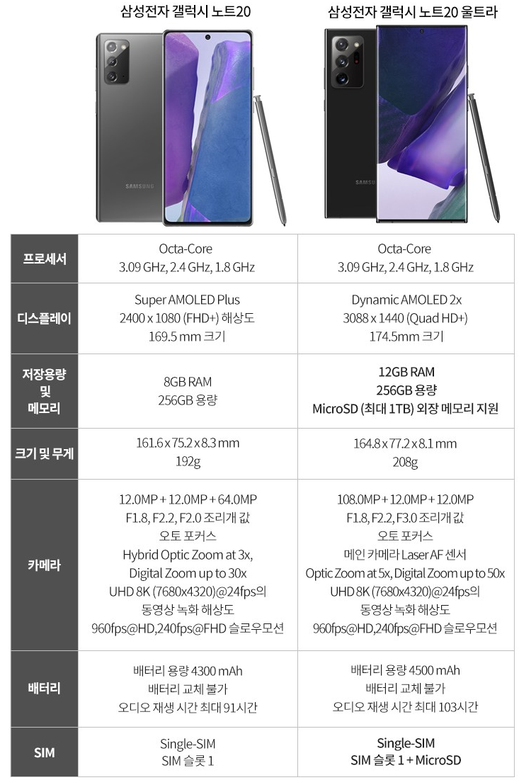 밑에 스팩을 보면 프로세서는 공통적으로 같지만 갤럭시노트20 보다 갤럭시노트20울트라가 전체적으로 업그레이드 되었다고 보면 된다.