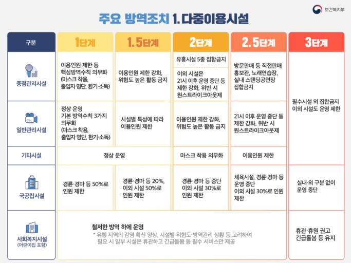 일반 관리시설 중 헬스장, 당구장 등 실내체육시설이 중단되며, 학원같은경우에는 코로나2.5단계에는 없었지만, 학생들의 외출을 줄이기 위해 추가됬다고 한다.