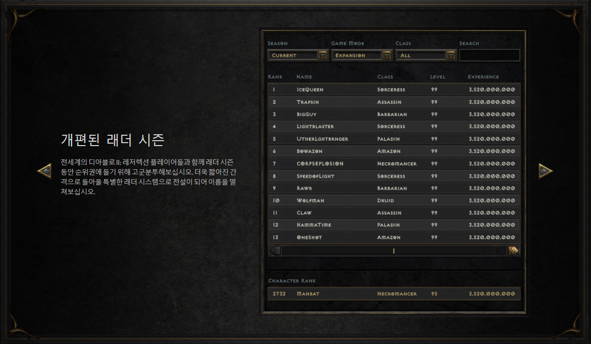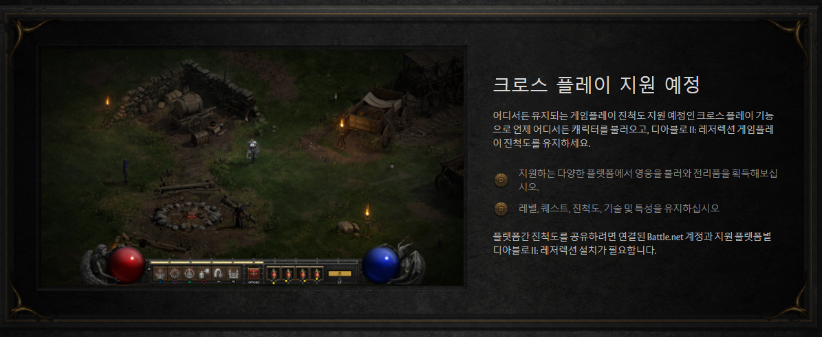 과거의 실시간 PK가 인기였는데 디아블로2 레저렉션에서도 분위기나 메커니즘, 대전모드는 전반적으로 같다고 한다. 신규 케릭터는 없으며 리마스터인 만큼 정통성을 살리는 것에 집중했다. 디아블로2 만의 정통성을 유지하면서 현대적인 게임을 참고하여 일부 개선된 점이 있지만, 최대한 정통성을 유지하는 쪽으로 발표했다.