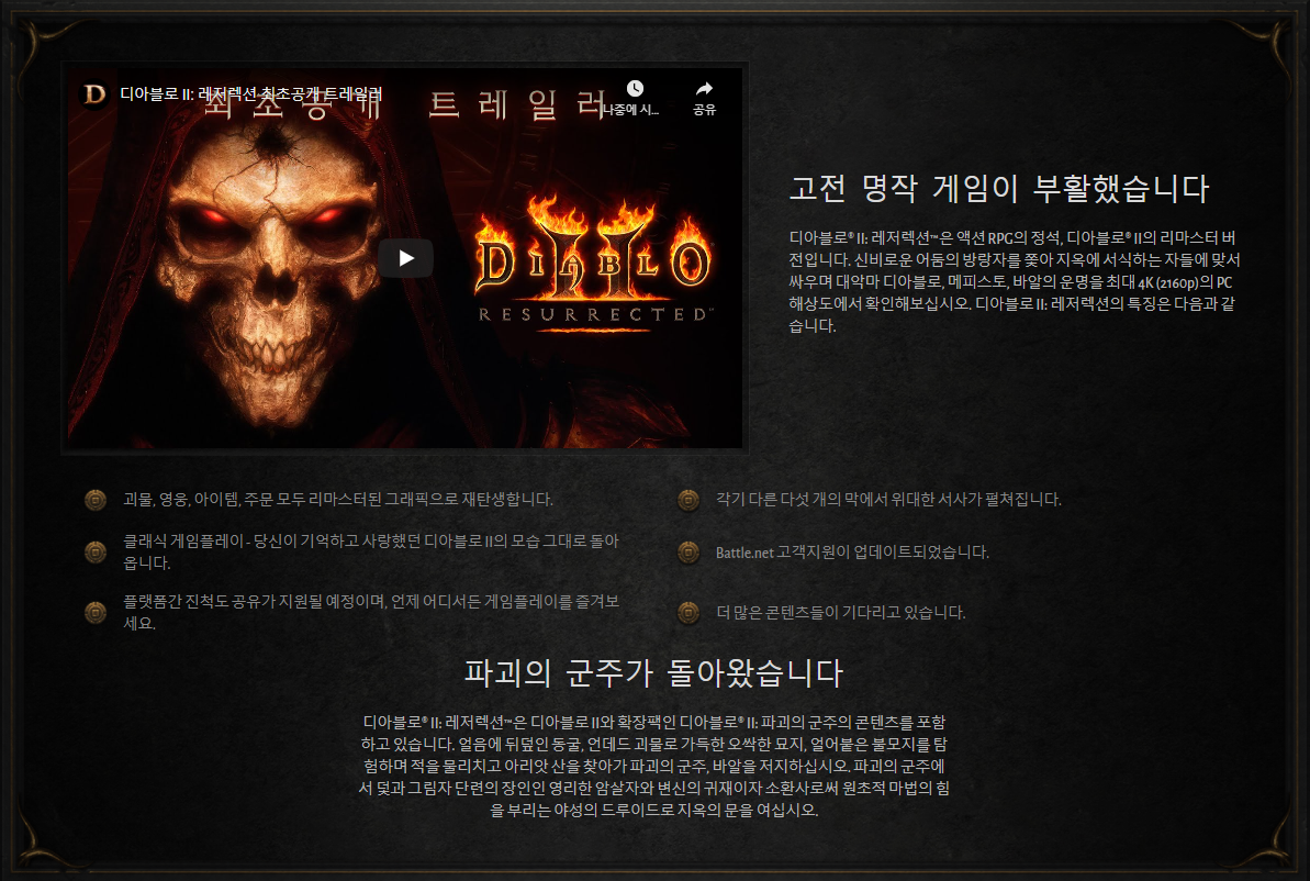 디아블로2 레저렉션으로 부활이라는 뜻의 이름을 달고 발표했다. 디아블로2가 20년만에 디아블로2 리마스터되어 2021년에 출시 예정이다. 오리지널팬과 디아블로2 출시당시 태어나지않은 팬 모두에게 접근하는 것을 중점으로 기본 성질은 유지하며 접근성을 높여 모두가 즐길 수 있도록 노력했다고 한다.
