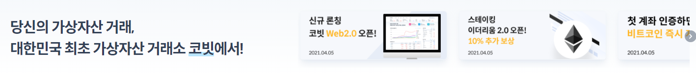 가상자산 거래소 코빗은 이번 '코빗 웹 2.0' 홈페이지 개편을 맞아 이더리움 2.0 스테이킹 서비스도 시작하며 오는 19일까지 스테이킹 참여자를 모집하며 참여자들에게 최소 0.01 이더리움부터 100 이더리움까지 코빗에 맡길 수 있다. 스테이킹의 시점부터 1시간마다 누적된 보상 현황을 확인할 수 있으며, 총보상의 10%가 추가로 지급된다. 이더리움 2.0 스테이킹을 시작으로 NFT(대체 불가 토큰) 부가서비스도 출시할 계획이다. 이벤트 기간 동안 코빗에서 신한은행 계좌를 최초로 입출금 계좌로 인증하면, 1만 원 상당의 비트코인을 지급해 준다. 4월 5일부터 리워드 소진 시까지 진행한다.