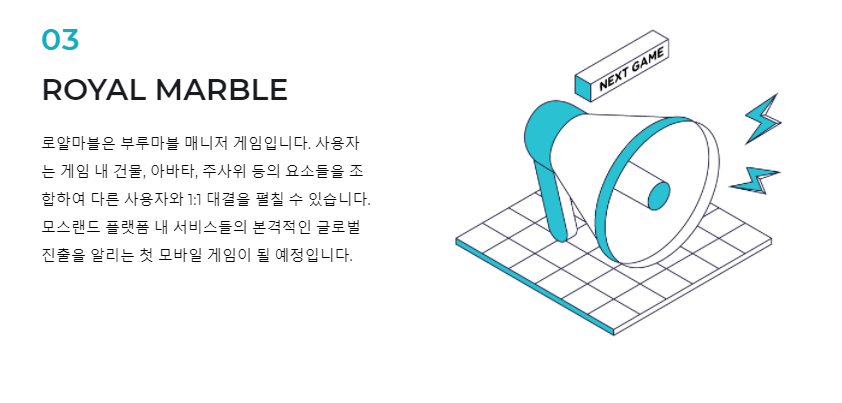 모스랜드(Mossland)는 현실과 가상 세계를 잇는 블록체인 기반 메타버스 프로젝트이다. Virtual Reality, Augmented reality, Non-fungible token 기반의 엔터테인먼트 서비스를 지속적으로 출시하며 실사용 사례들을 만들어 가고 있으며 모스랜드 메타버스는 현실에 반영된 디지털 NFT 자산과 엔터테인먼트 서비스를 특징으로 하며, 모스 코인(MOC)으로 통합된 경제 순환 구조를 추구하고 있다.