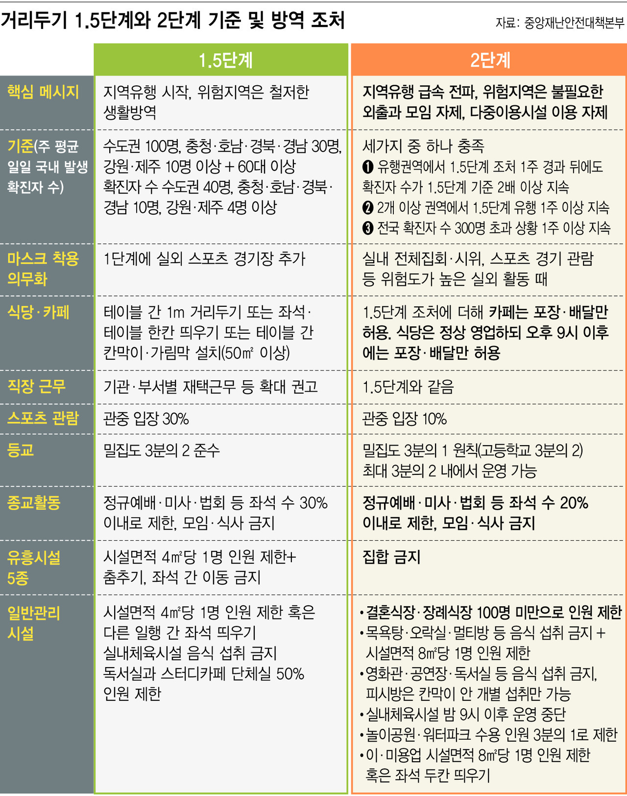 | 2단계 | 1.5단계 조치 후에도 지속적 유행 증가 양상을 보이며, 확산되는 조짐 관찰 | -전국 일일 확진자 수 300명 초과상황 1주 이상 지속 |