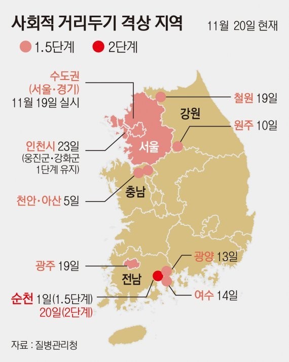 현재 지역별로 단계가 올라가 있고 1단계, 1.5단계, 2단계, 2.5단계, 3단계로 총 5단계로 나눠져 있으며 예전 3단계보다 더 디테일하게 변경되었습니다.